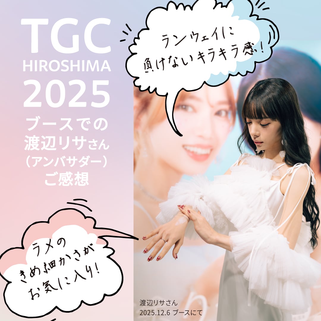 ■ つけた瞬間、上がるテンション!エマステラはTGC HIROSHIMA 2025でお披露目し、アンバサダーの渡辺リサさんに、実際にランウェイを歩く時に付けてもらいました♪キラキラになった肌は注目を集め、自分自身のテンションも上がります!次はあなたの日常もキラキラにしてみませんか?